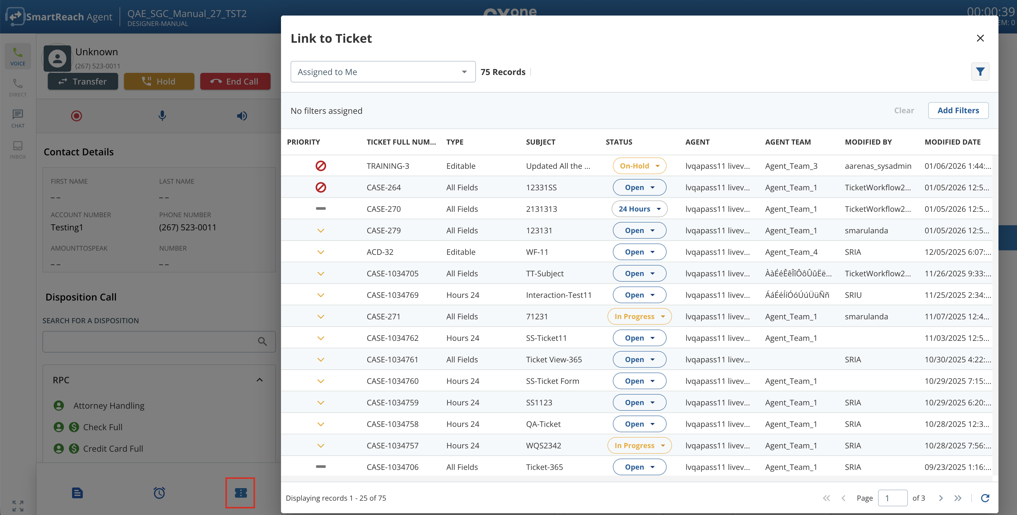 : Enables agents to link an interaction to a ticket from the agent desktop. Clicking the Link to Ticket icon opens the Link to Ticket window. From the Link to Ticket window, you can select a ticket and apply it to an interaction. For more information, see the